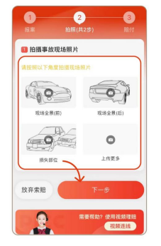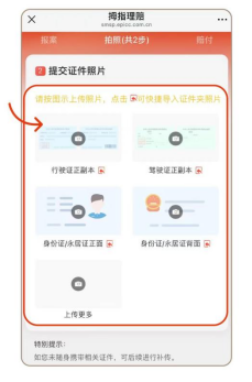进入拍照页面,按照页面提示拍摄事故现场照片并上传证件资料。