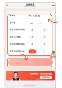 选择【车险报案】,确认车辆、事故信息,点击【下一步】