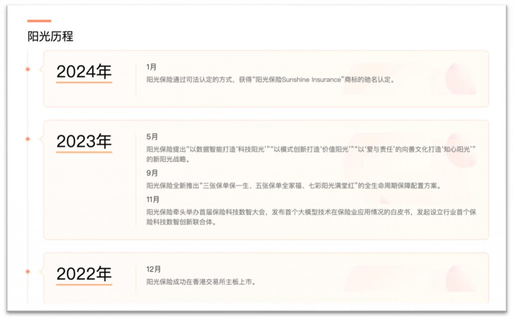 2023 年度业绩公告显示,阳光保险以机制创新为突破,构建内部自主创新和外部协同创新的双轮驱动科技创新体系。把握时代机遇,发力人工智能,率先建设保险垂直领域阳光正言 GPT 大模型,推动销售智能化、服务智能化、管理智能化落地,着力应用于客户服务、销售支持、智能理赔、员工办公等现实场景。持续深化数字化转型,加快数字化客户洞察、数字化营销、数字化风控、数字化产品创新、数字化运营五大核心能力建设。以数字化智能化转型推动公司高质量发展。