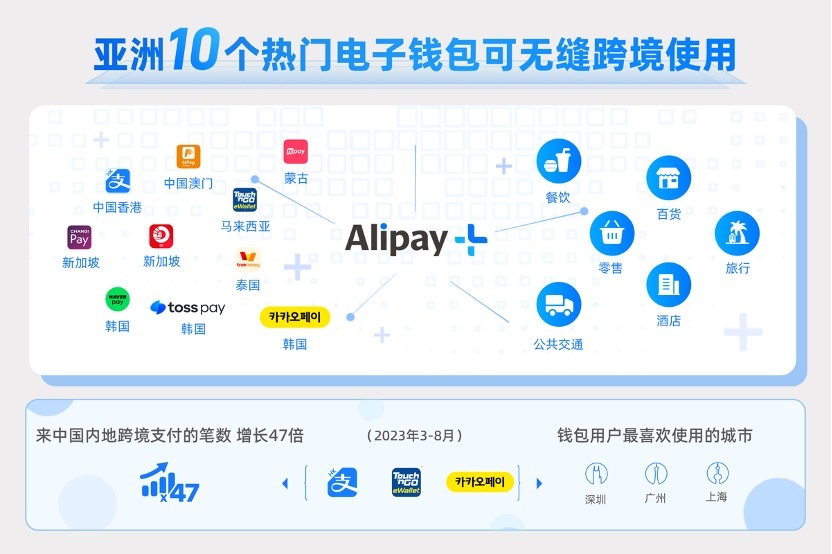 2023年3月至8月期间,通过Alipay+接入的首批境外钱包Kakao Pay、Touch 'n Go eWallet和AlipayHK的在境内支付总笔数在6个月内增长了47倍。上海、广州和深圳是最受韩国、马来西亚和香港特别行政区移动支付游客青睐的城市。餐饮、零售和交通是最常见的三个交易场景。