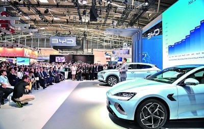 图为9月4日在德国慕尼黑国际车展媒体预展上拍摄的比亚迪发布会现场。新华社发